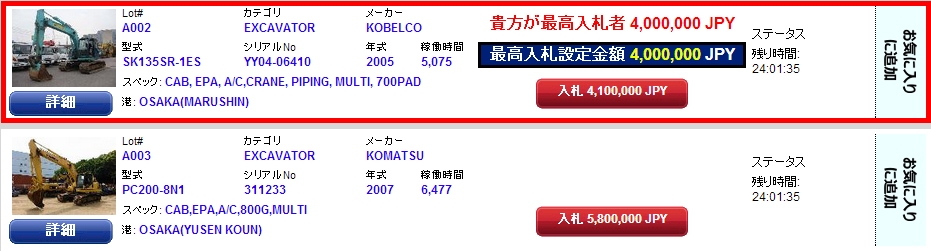 入札を行う際は各建機の入札ボタンに表示されている金額(最低入札可能金額)を御確認頂き、入札ボタンをクリックで入札画面へ移動致します。